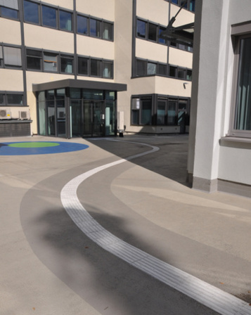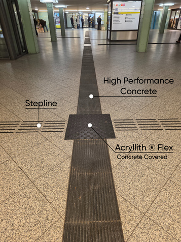 The tactile guidance system with floor indicators consists of an aqueous polymer with mineral fillers. A flexible polymer concrete – emission-free, solvent-free + ecologically pure + sustainable. The material is highly durable – weather-resistant – sustainable – long-lasting + recyclable. Movements of the substrate caused by frost and heat are absorbed. Acryllith® Flex is free of solvents, harmful substances, and emissions. Acryllith® Flex is flame-retardant – certified according to DIN EN ISO 6239-1:2010 in conjunction with DIN 13501-1:2018. Acryllith® Flex meets the criteria for class Bfl-s1.